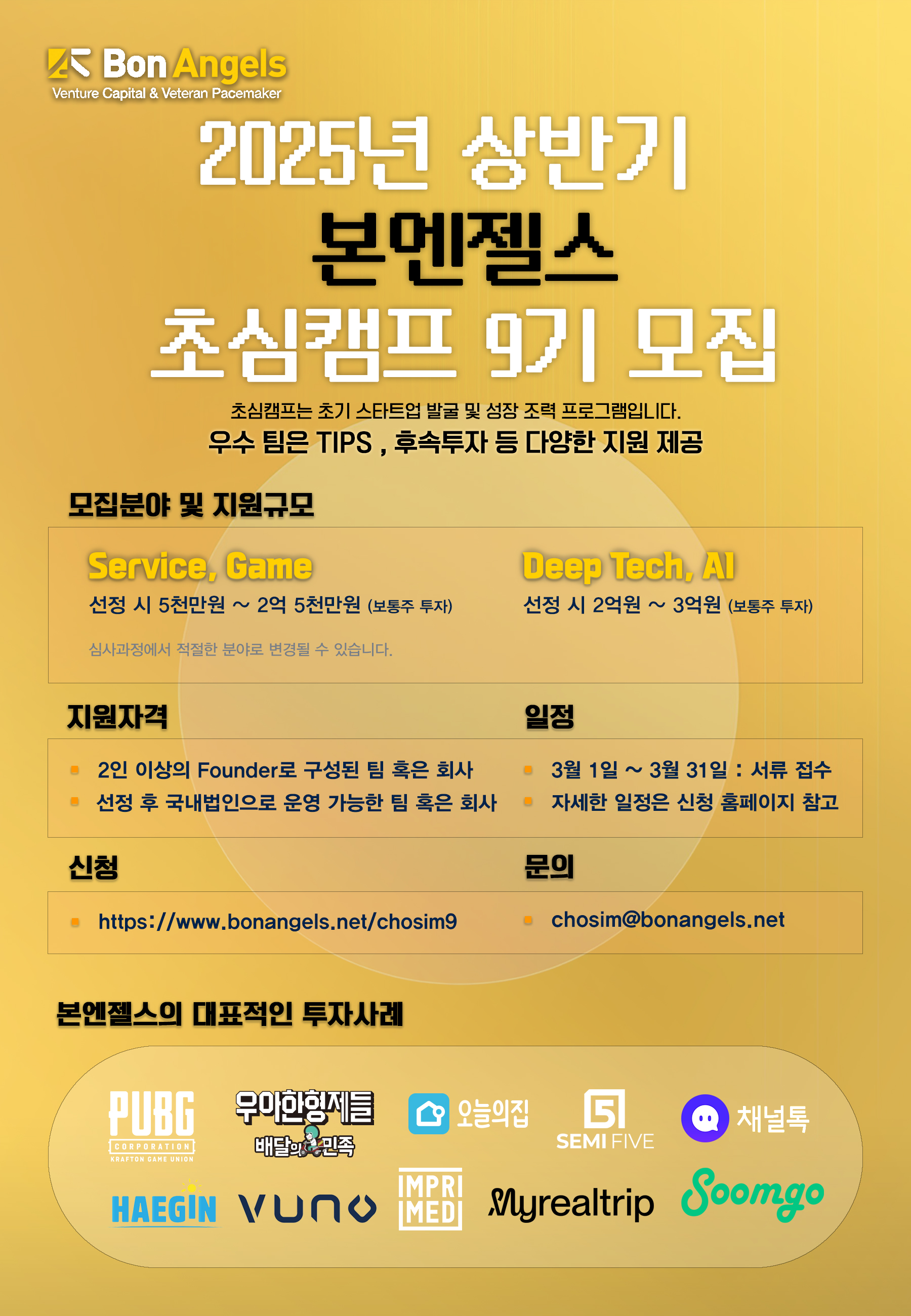 공모 내용 표 제목 2025년 상반기 본엔젤스 초심캠프 9기 모집 접수기간 2025-03-13 ~ 2025-03-31 사업기간 2025-03-13 ~ 2025-03-31 첨부파일 접수 목록