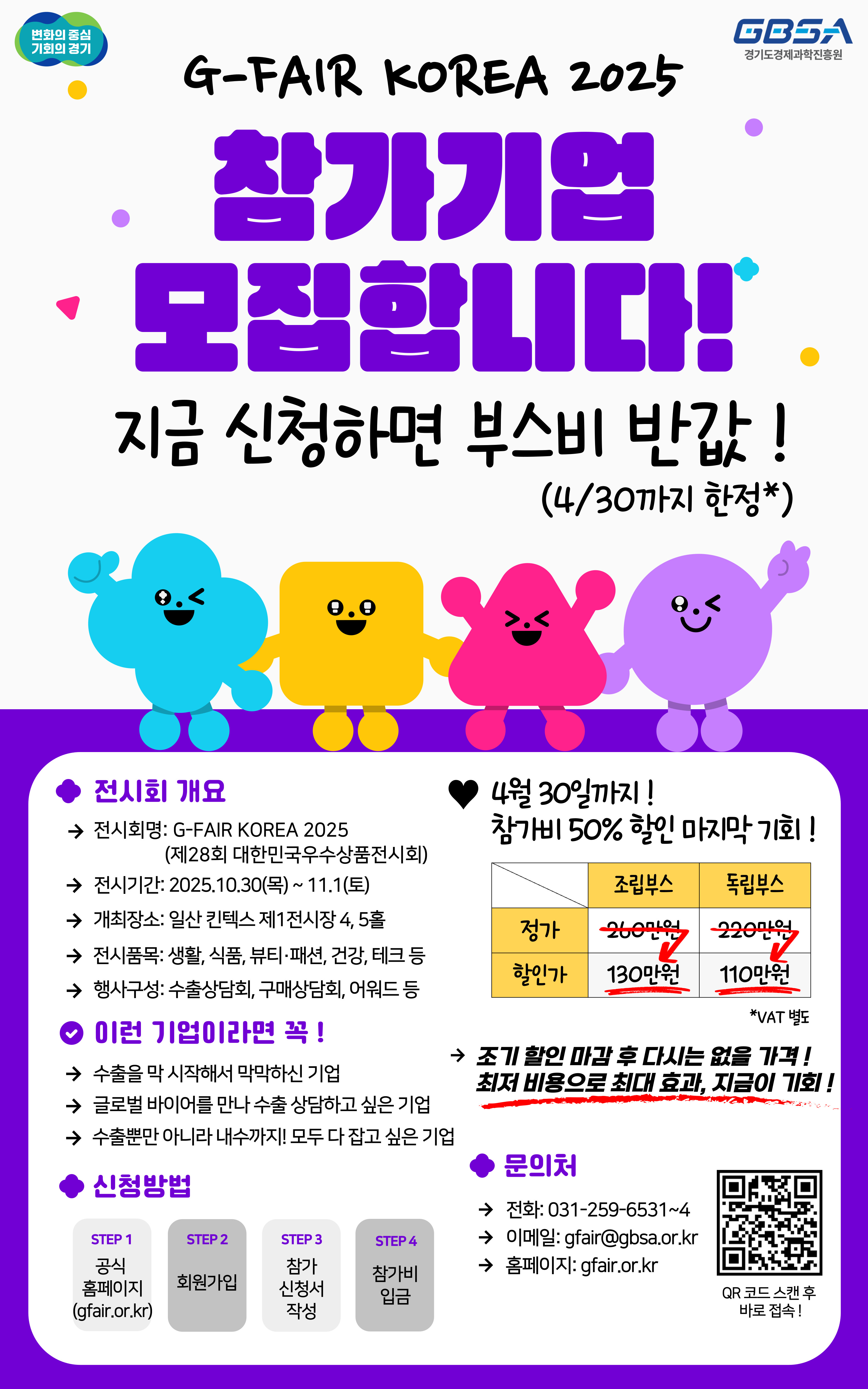 공모 내용 표 제목 G-FAIR KOREA 2025 대한민국 우수상품 전시회 참가기업 모집 접수기간 2025-04-08 ~ 2025-04-30 사업기간 2025-04-08 ~ 2025-04-30 첨부파일 접수 목록