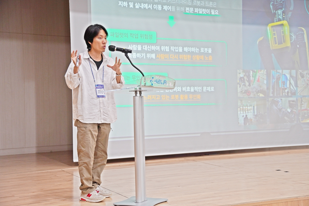 오에녹 ㈜에이치오피 대표가 GPS가 닿지 않는 실내 공간에서 드론과 로봇의 자율 이동을 제어하는 시스템을 발표하고 있다.