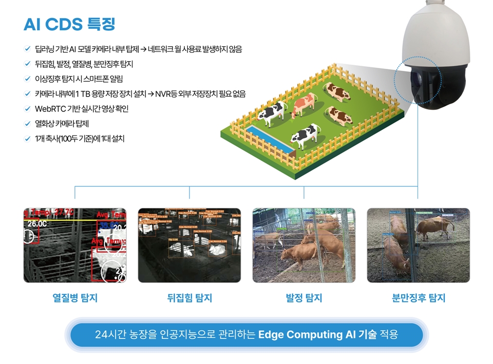Their AI CDS (Cattle Abnormality Detection System) integrates thermal and RGB cameras into an on-device AI system that monitors livestock around the clock for signs of heat, calving, flipping, and potential heat diseases, significantly enhancing farm productivity.